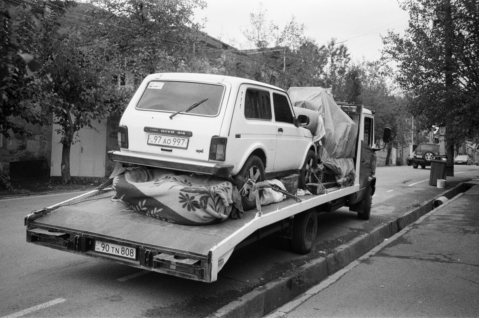 Belongings and a vehicle loaded onto a tow truck to be taken out of Artsakh. The arriving vehicles were packed with belongings. Items were tied to the roofs, trunks, and hoods of cars. People tried to take as much as possible with them. As many admitted, they did this because they did not believe they would be able to return home. September 2023.