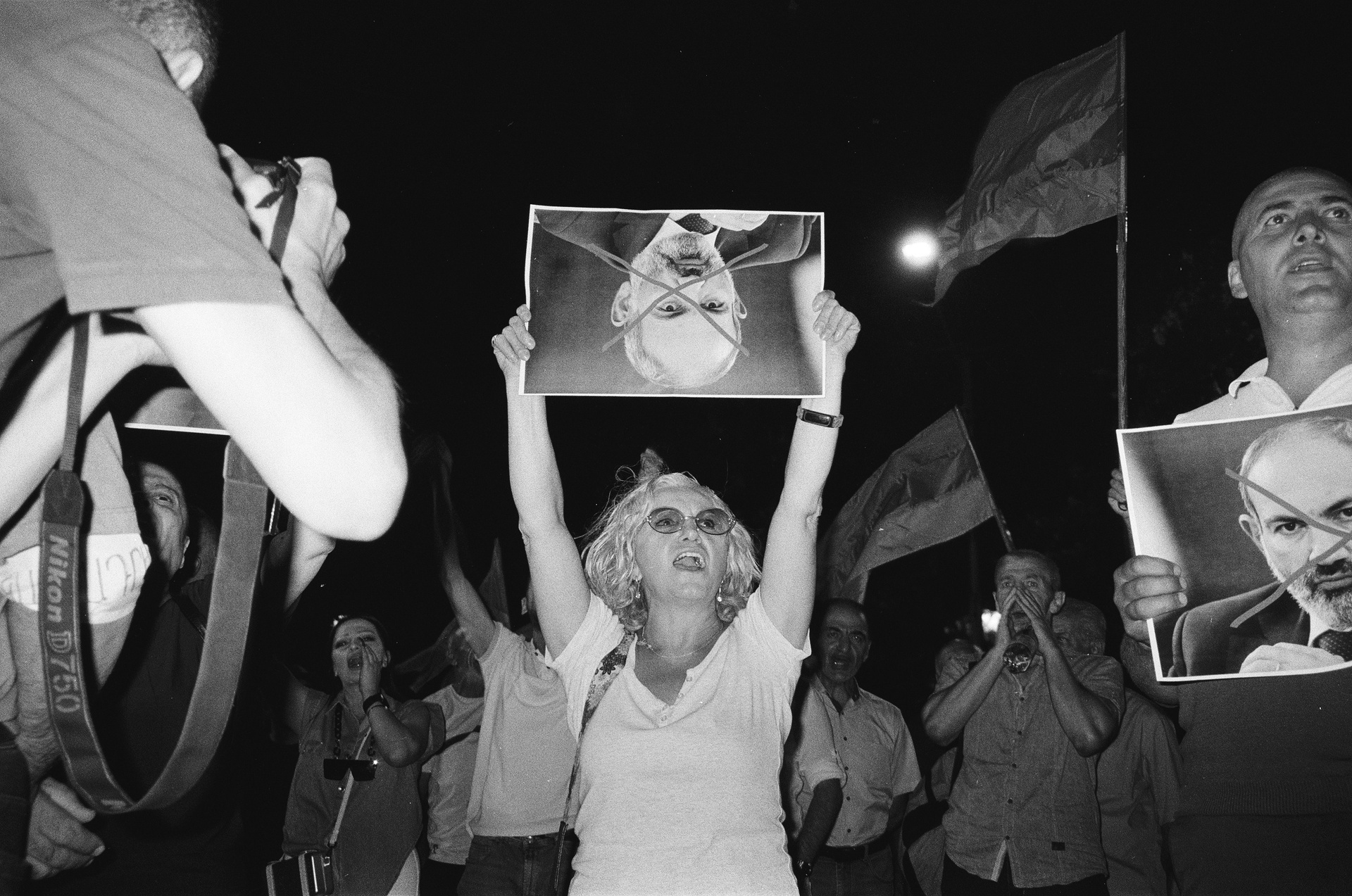 A participant of the National Democratic Pole (Bever) rally holds a crossed-out portrait of Prime Minister Nikol Pashinyan. Bever held their rallies very intensively and had announced a major rally at the end of August 2023. However, it never took place. Few people showed up, the protesters did not engage in conflict with the police, and returned to Freedom Square, from where they had begun their march. Most of Bevor’s rallies are accompanied by the musical piece O Fortuna, played through speakers mounted on a pickup truck. August 2023.