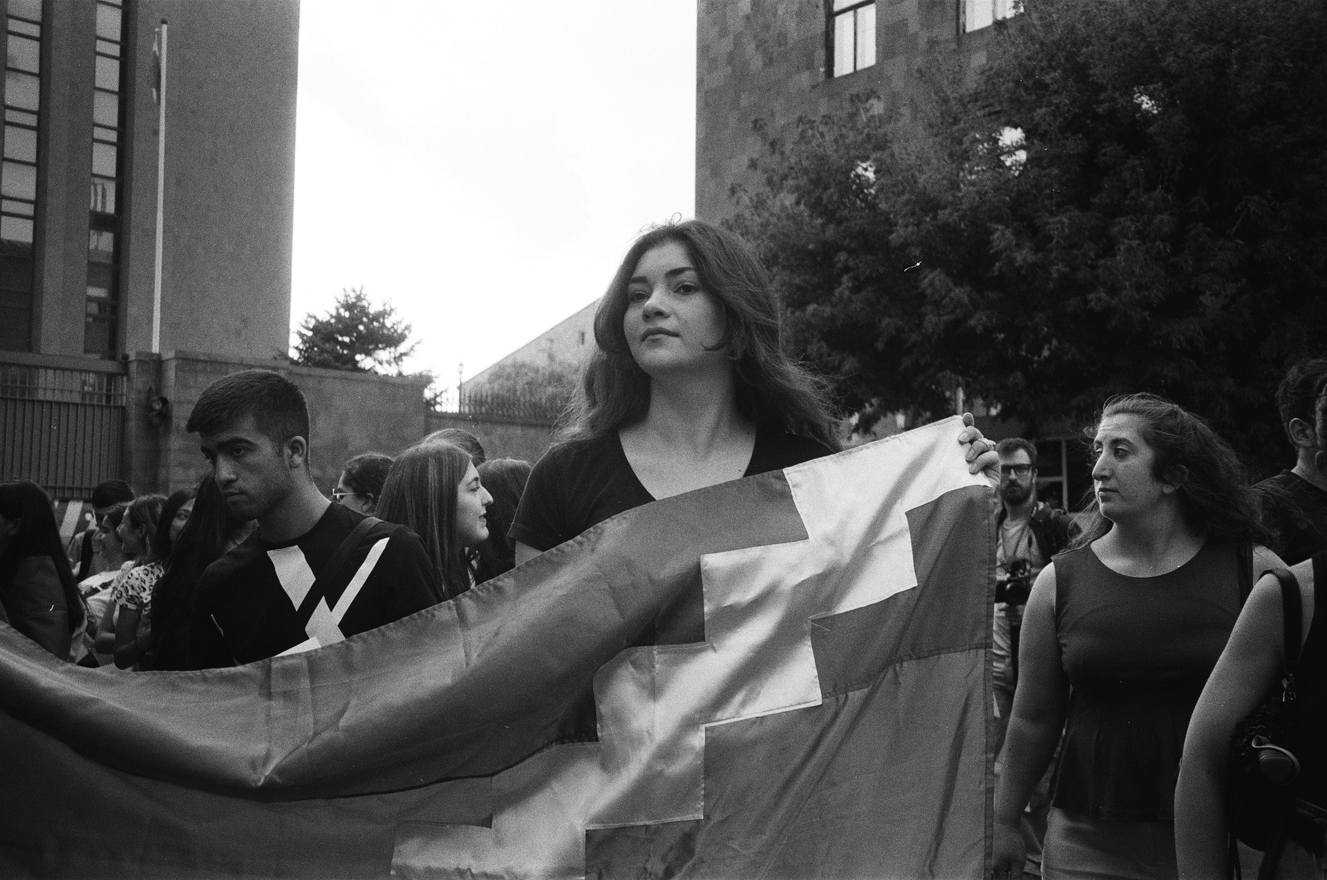 A protester near the Embassy of the Russian Federation holds the flag of Artsakh. On August 28, three students from Artsakh were detained by Azerbaijani border guards near the Akari Bridge, where a checkpoint had been set up. The rally at the Russian Embassy was held because the students were traveling from Artsakh to Armenia under the escort of Russian peacekeepers.