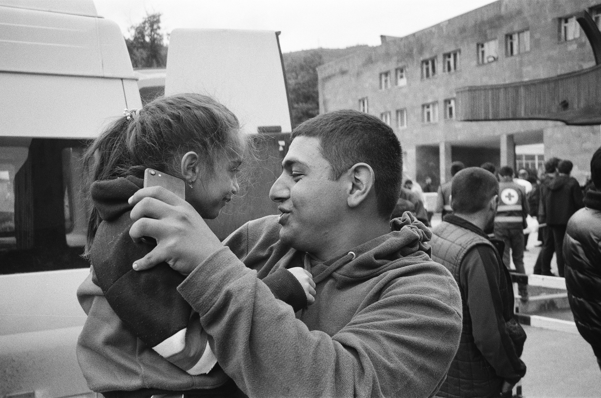 A man entertains a child in front of the refugee reception center. Adults tried to create a positive atmosphere for the children. Volunteers distributed sweets, and relatives entertained the kids. It was not uncommon to see someone comforting a crying person on one side of a bench, while on the other side, a child was being made to laugh. September 2023.